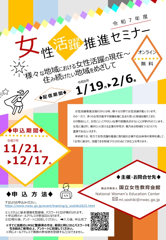 独立行政法人国立女性教育会館主催で、令和7年度「女性活躍推進セミナー」が開催されます。(無料・オンライン)
