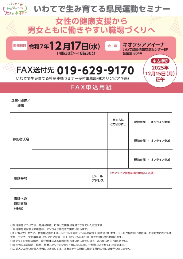 いわてで生み育てる県民運動セミナー「女性の健康支援から男女ともに働きやすい職場づくりへ」