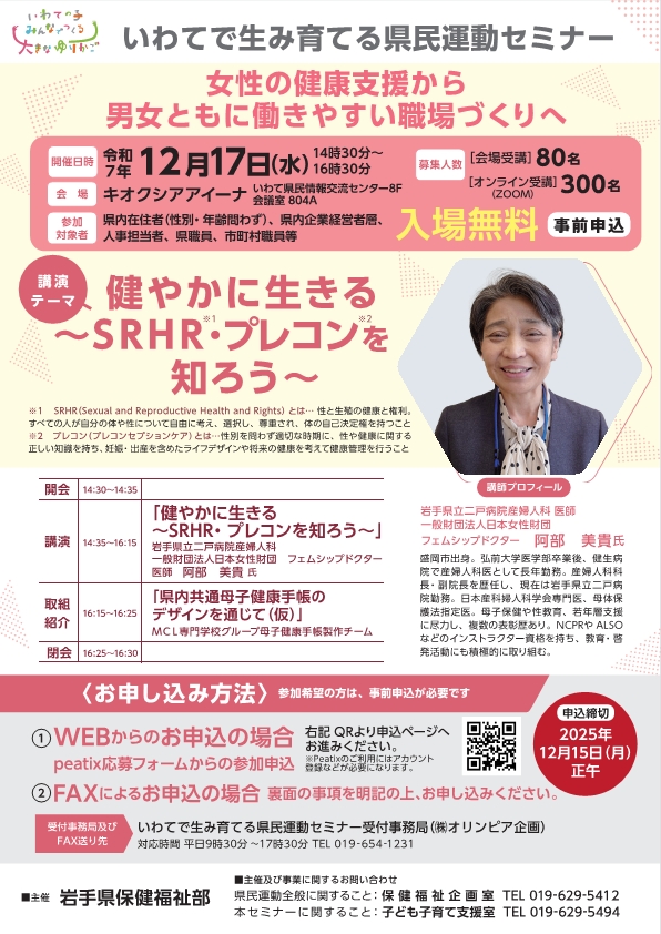 県では、女性が安心して働き、妊娠・出産子育てができる環境をつくるためには、女性特有の健康課題への取組が重要であることから、近年注目されているSRHR(※1)やプレコンセプションケア(※2)について、県民一人ひとりが理解を深め、行動変容につながるよう、いわてで生み育てる県民運動の一環として、12月17日(水)に「女性の健康支援から男女ともに働きやすい職場づくりへ」をテーマとした企業向けセミナーを開催します。