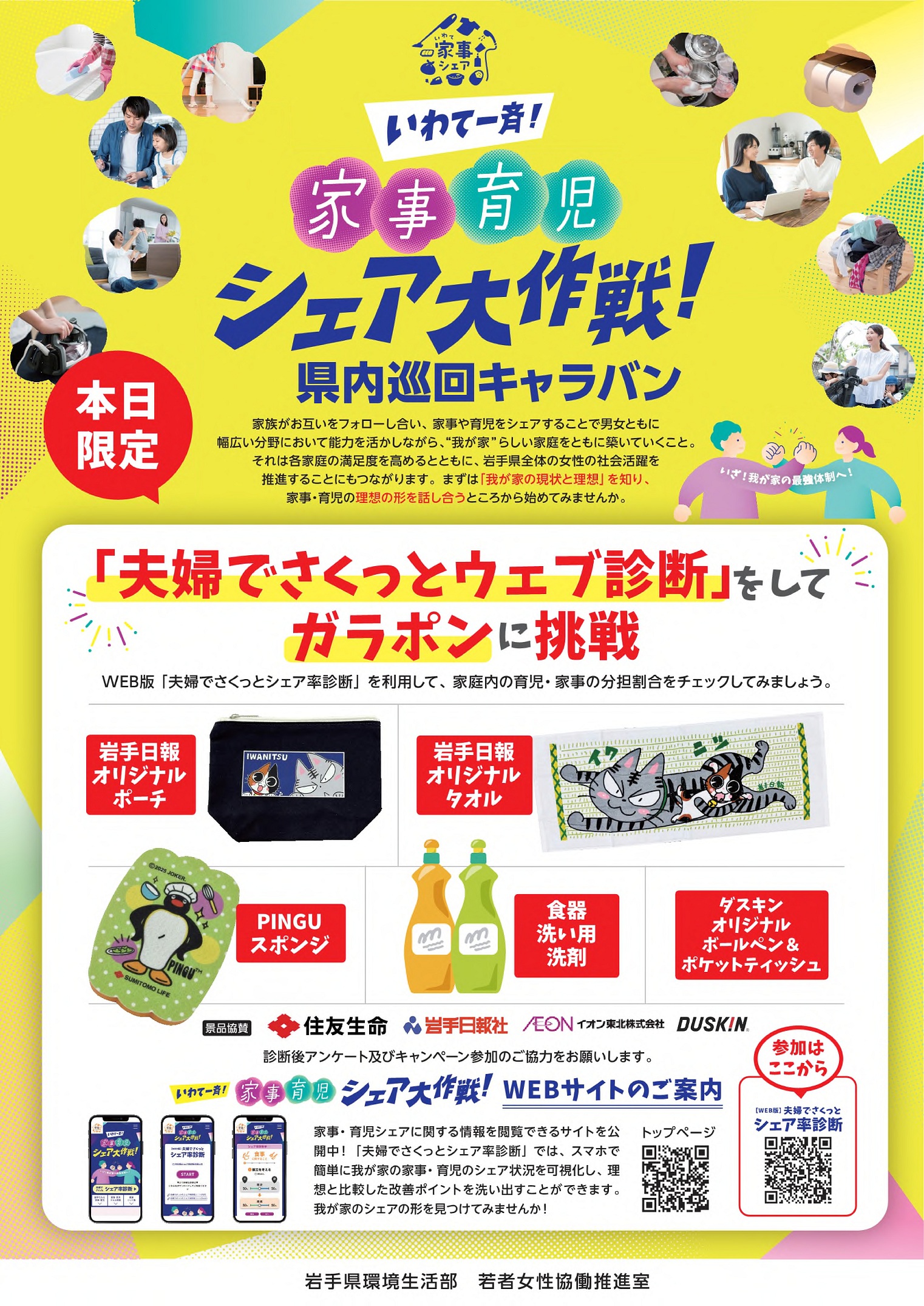 現在実施中のキャンペーン「いわて一斉!家事・育児シェア大作戦!」をPRするキャラバンカーがイオンモール盛岡南にやってきます。日時:10月25日(土) 10時~14時場所:イオンモール盛岡南 イオンバイパス側出入口付近25日限定で、家事便利グッズが当たるガラポン抽選会を実施します。ぜひ、お越しください。